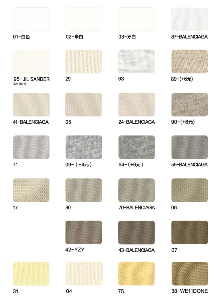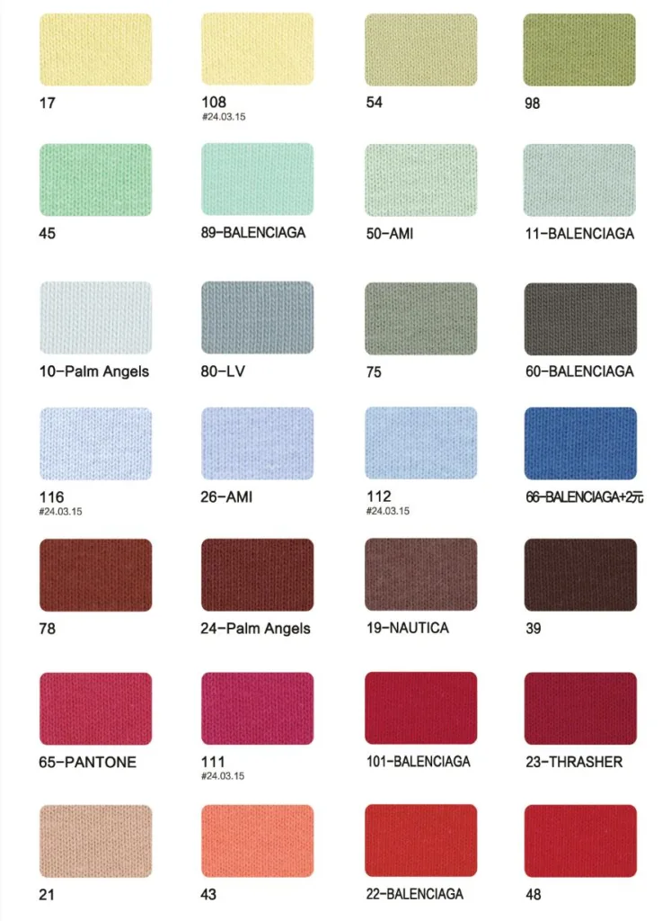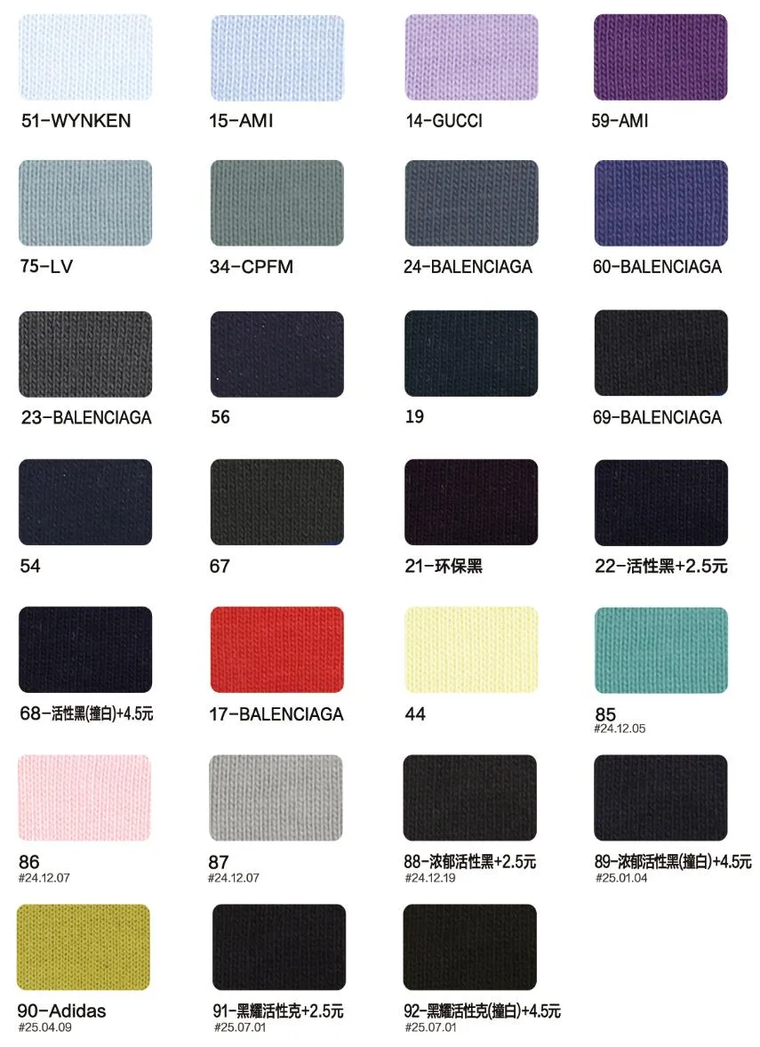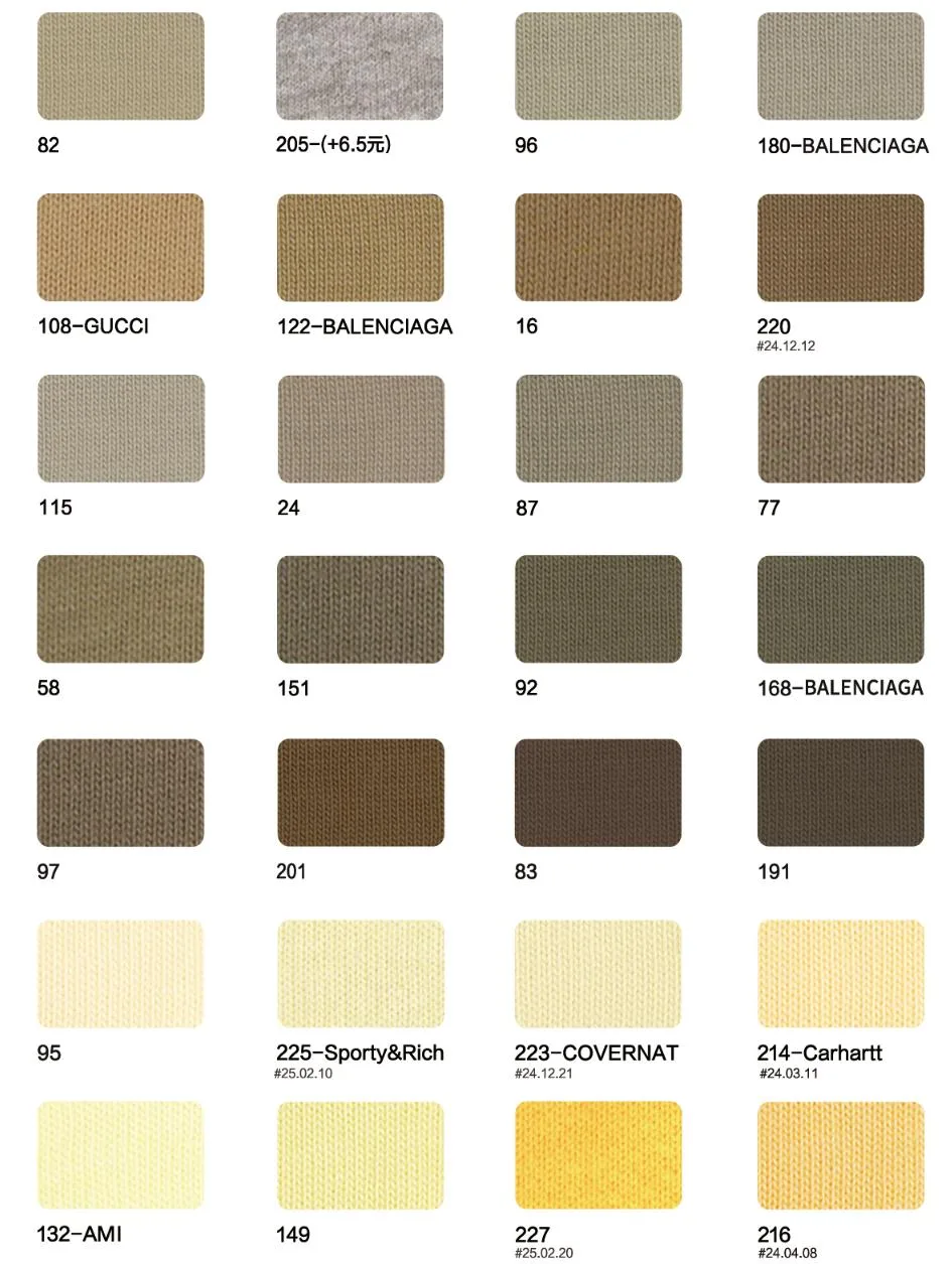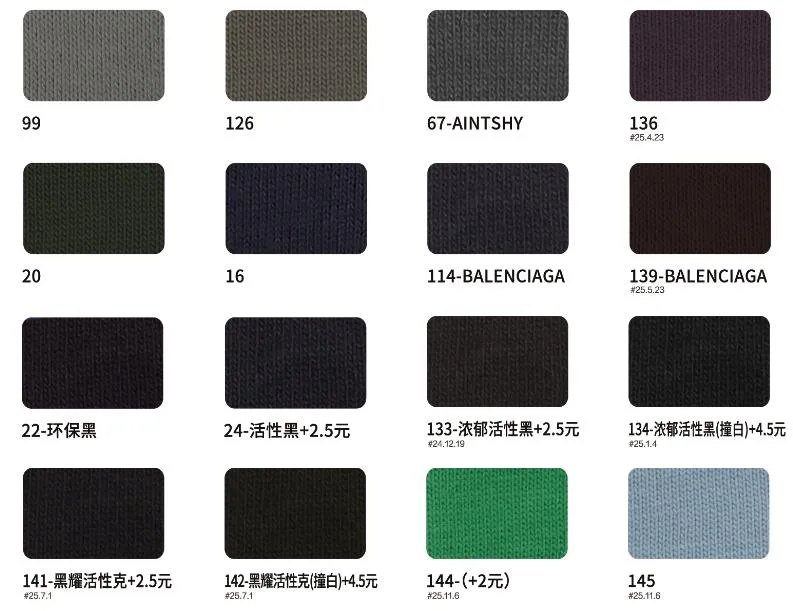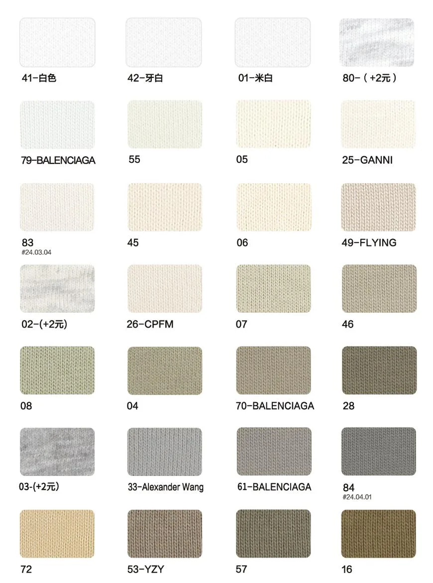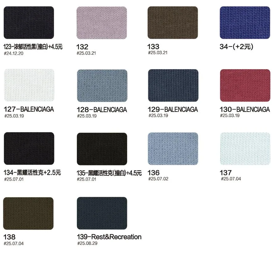 This page showcases popular T-shirt jersey fabrics with weights ranging from 195GSM to 385GSM, all crafted from 100% combed cotton.