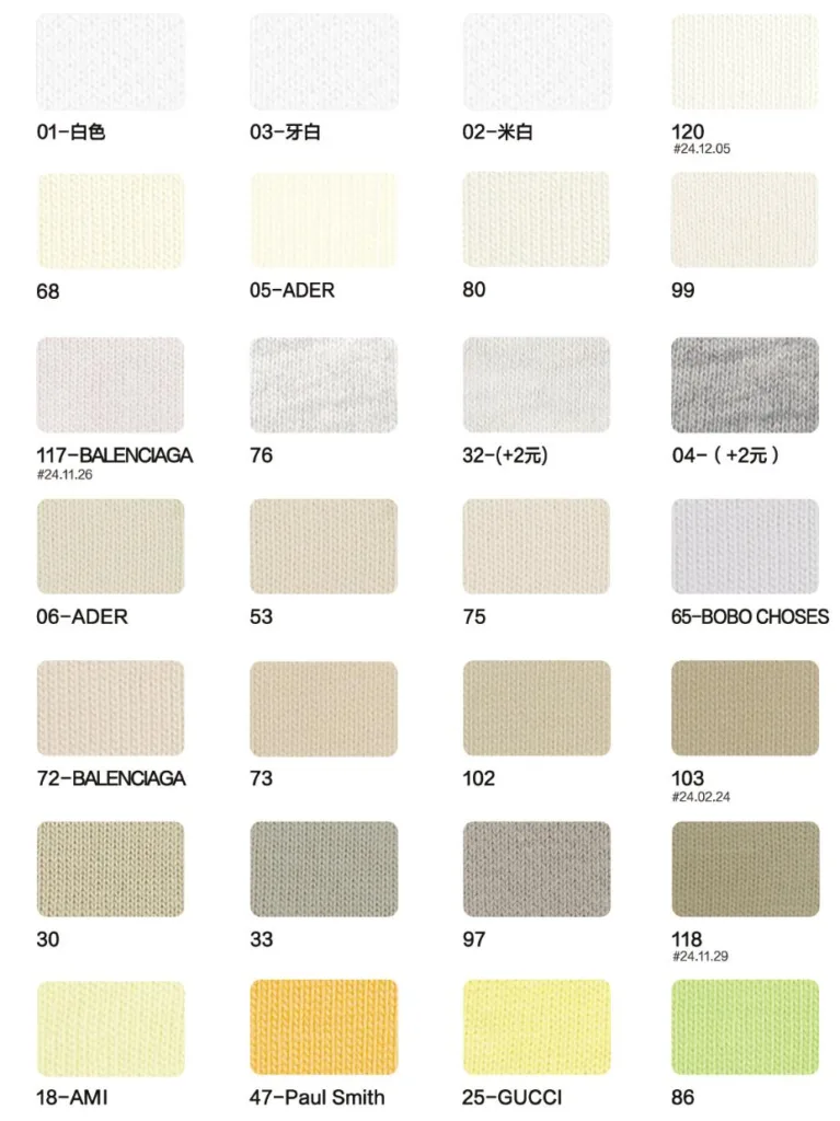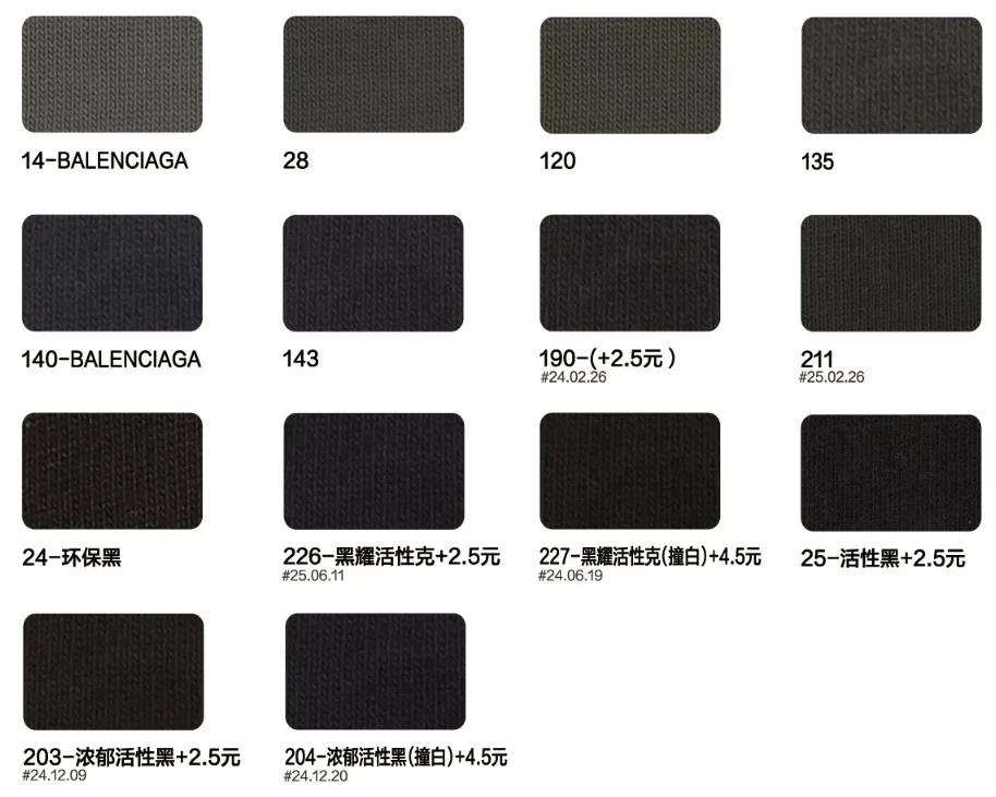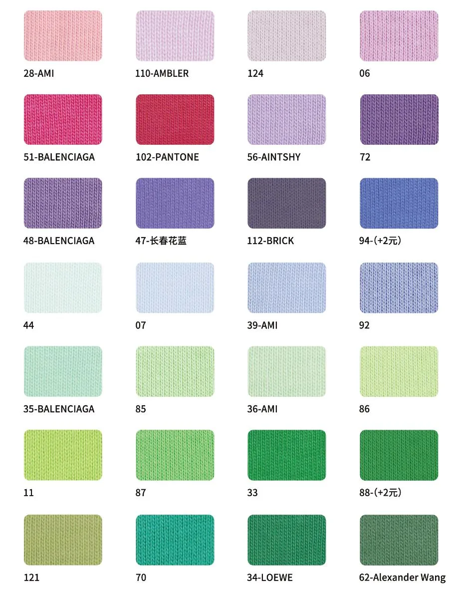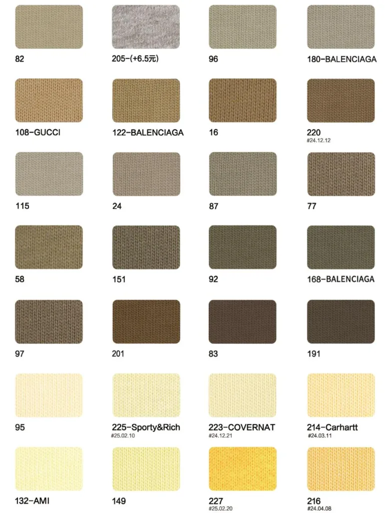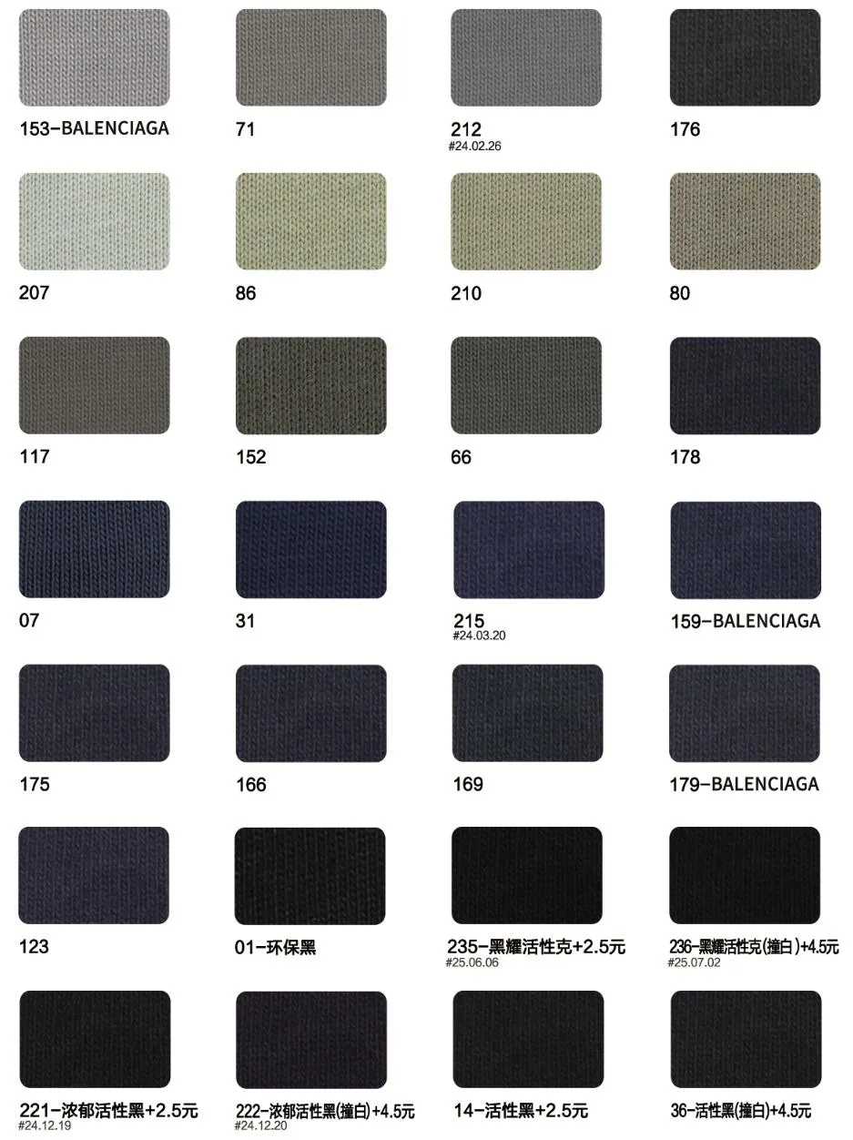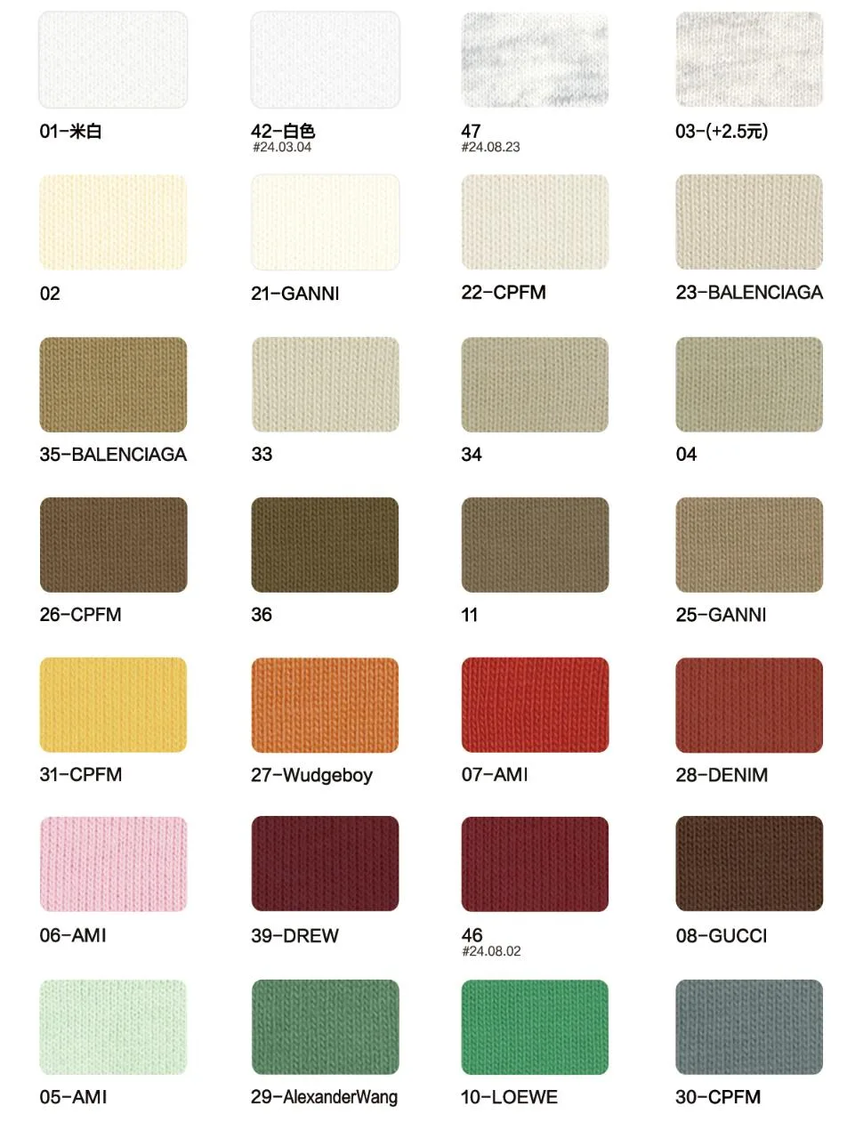 This page showcases popular T-shirt jersey fabrics with weights ranging from 195GSM to 385GSM, all crafted from 100% combed cotton.
