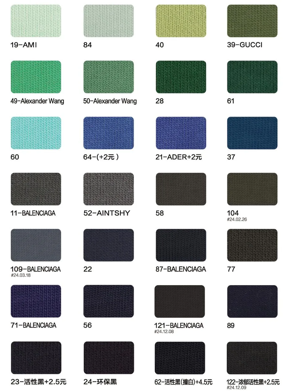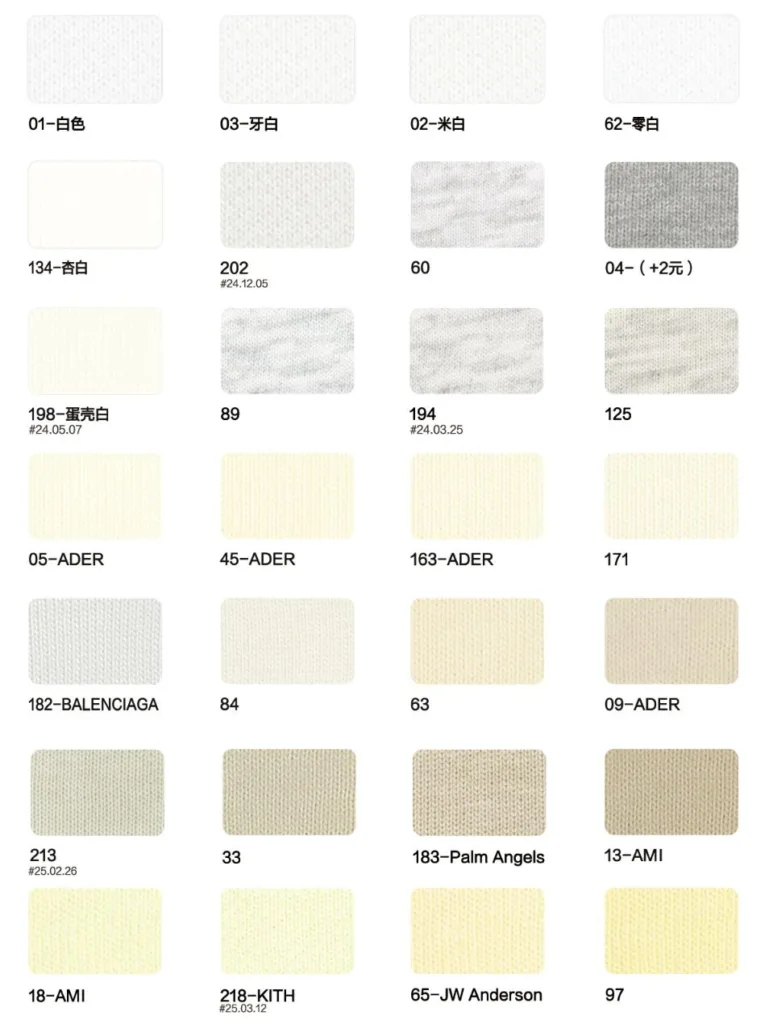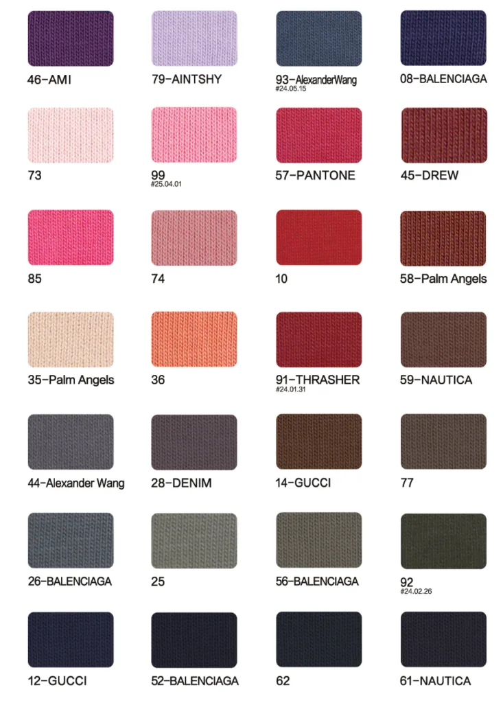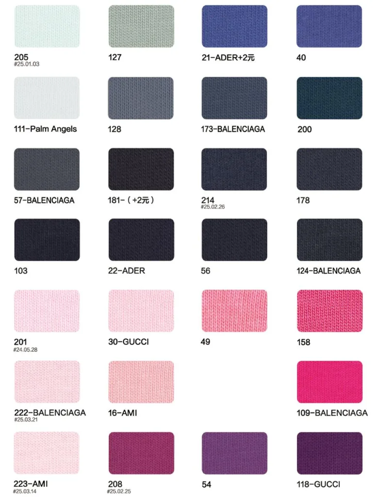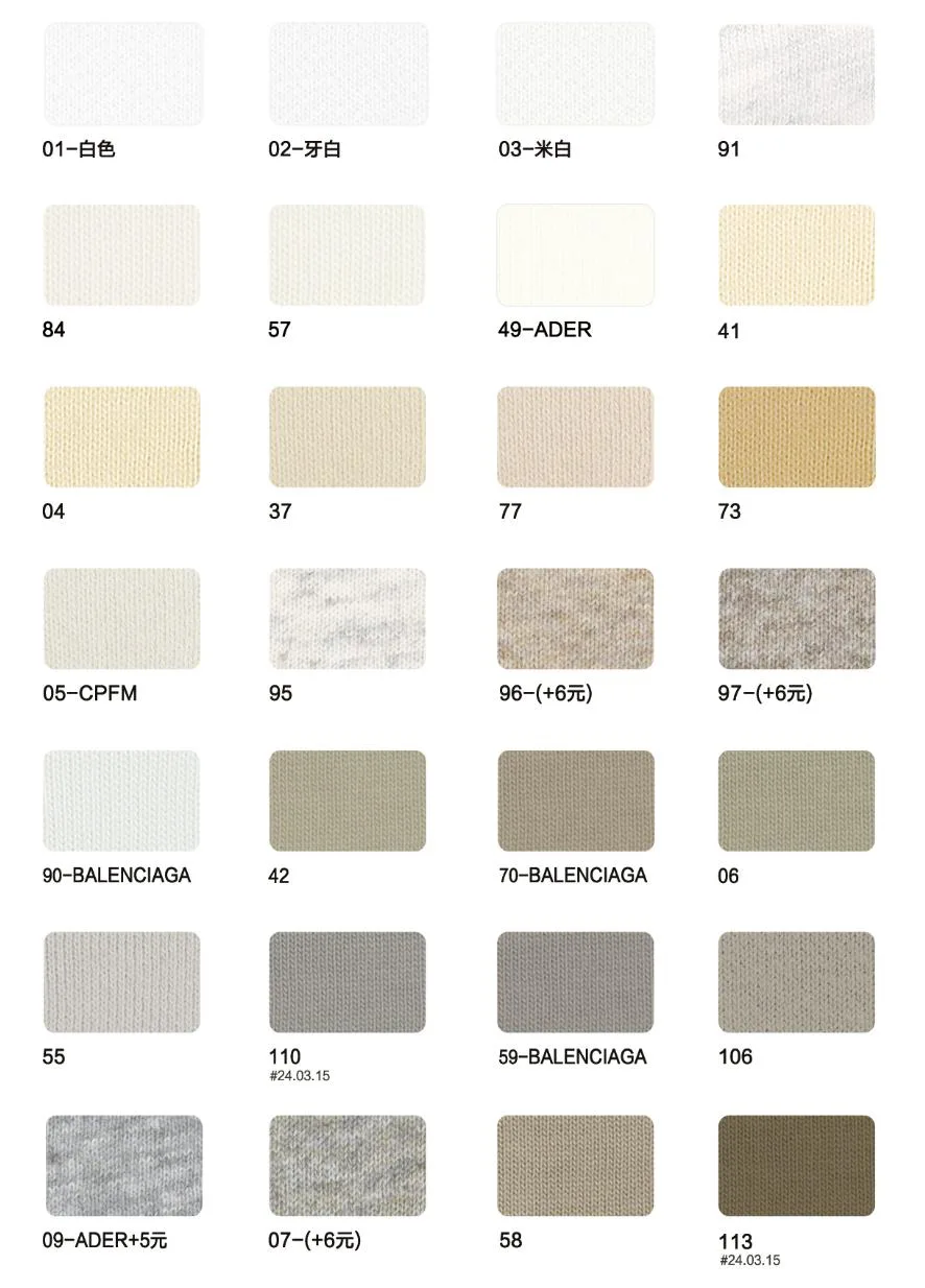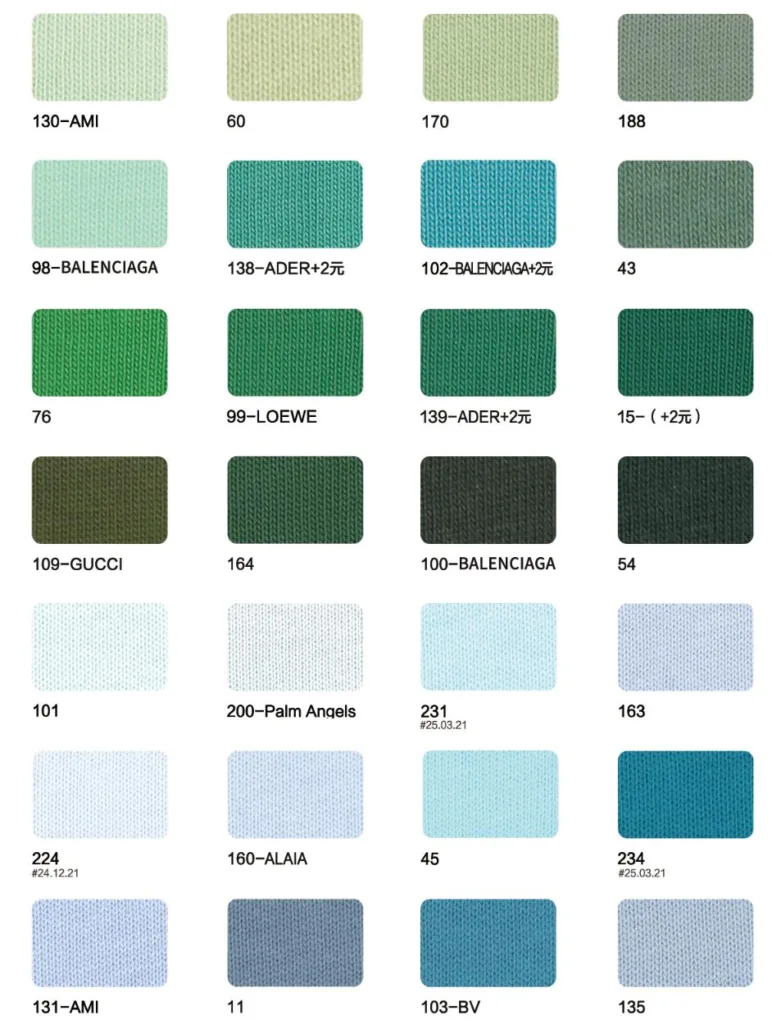This page showcases popular T-shirt jersey fabrics with weights ranging from 195GSM to 385GSM, all crafted from 100% combed cotton.